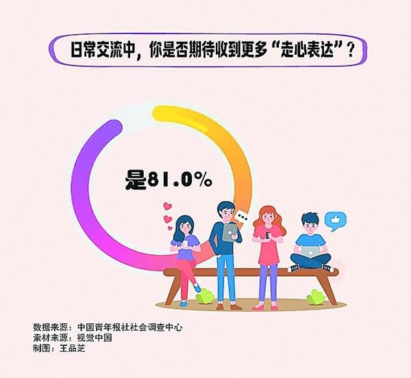 近日,中国青年报社社会调查中心联合问卷网(wenjuan.com),对1340名受访者进行的一项调查显示,在日常交流中,81.0%的受访者期待收到更多“走心表达”。