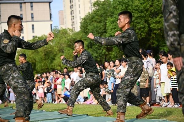 近日,武警安徽总队某部举办“军嫂军娃进军营”活动,200余名军嫂军娃“探班”军营。该部通过组织观摩武器装备、观看课目演示等,让来队的军属感受部队大家庭的温暖,提升军属的归属感、幸福感和荣誉感。图为军嫂军娃们观看摔擒技术动作演示。徐伟/摄