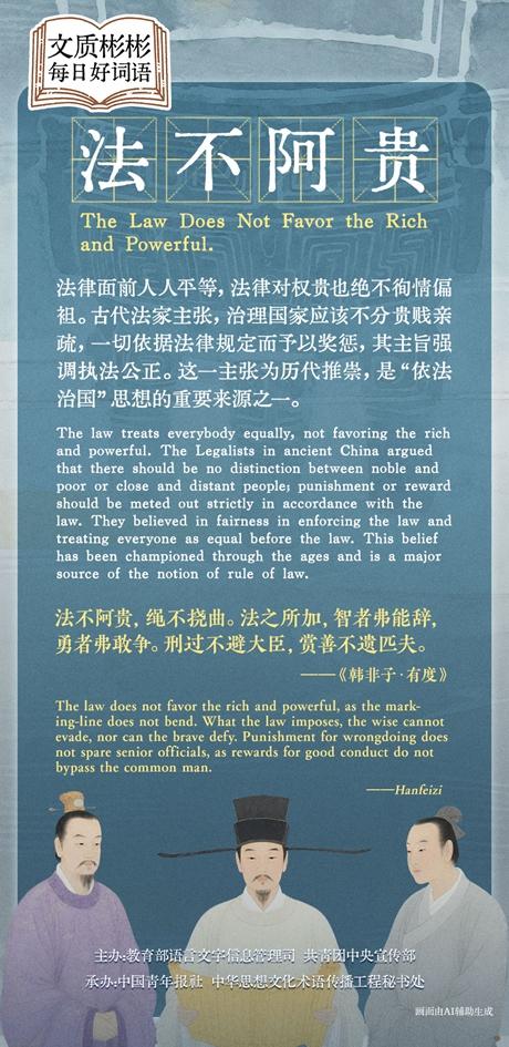 法不阿贵,绳不挠曲。法之所加,智者弗能辞,勇者弗敢争。刑过不避大臣,赏善不遗匹夫。(《韩非子·有度》)(法律不偏袒权贵,正如墨线不随弯就曲。面对法律应有的制裁,再聪明的言辞也不能推脱,再勇猛的抗争也无济于事。惩罚罪过不豁免王公贵族,奖励善行不遗漏平民百姓。)