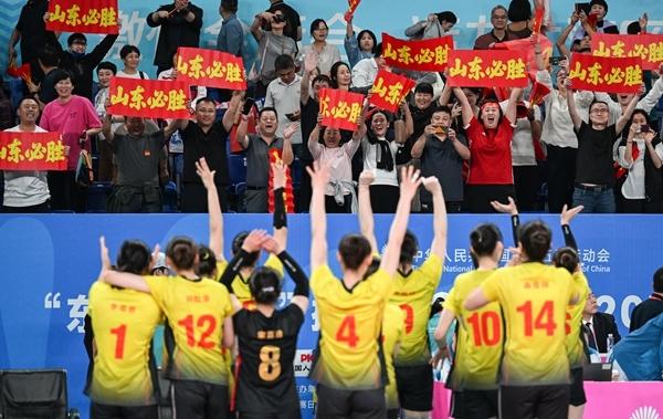 当日,在广东江门举行的第十五届全国运动会排球女子20岁以下组1-4名半决赛中,山东队3比1战胜江苏队。新华社记者 陈钟昊/摄