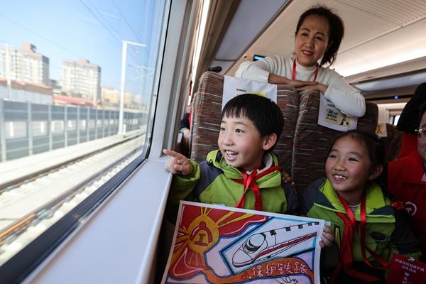 12月7日,师生代表在延安站开往西安北站的复兴号动车组列车上观赏沿途风景。当日,来自西安、延安、铜川、渭南四市的西延高铁沿线居民及中小学师生代表参加西延高铁爱路护路主题宣传活动。