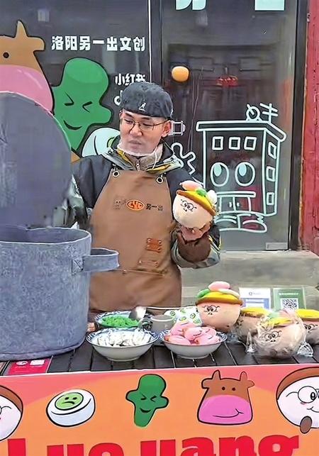 王泽茗是土生土长的洛阳人,从意大利学设计回国后,创业卖“牛肉汤”爆火。他希望做出和消费者有情感链接的设计,把洛阳人从小喝到大的牛肉汤结合毛绒玩偶,大家可以选择汤的种类,要不要葱花,要饼丝还是油旋,做出一款属于自己的汤,变成游客带走的“城市记忆”。消费者的购买过程也是情绪价值拉满,让食客在味蕾满足之余,更获得了文化认同与情感慰藉。