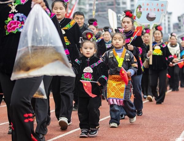 1月2日,贵州省黔东南苗族侗族自治州榕江县,少数民族群众在第四届贵州“村超”开幕式上参加巡游活动。当日,第四届贵州“村超”开幕式在榕江县“村超”球场举行。本届“村超”预选赛从1月2日持续至4月19日,20强赛预计4月底开始,7月底结束。视觉中国供图