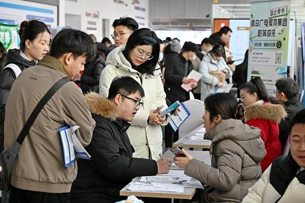 1月30日,求职者在青岛西海岸新区人力资源大市场参加“青雁归巢”招聘会。
