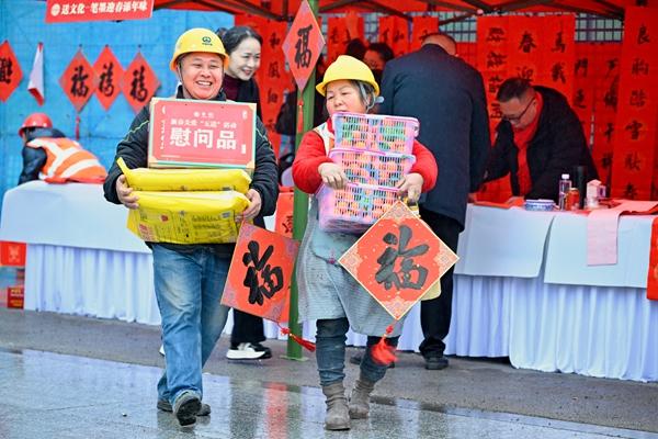 1月30日,四川宜宾三江新区高铁片区保障性租赁住房项目建设工地,两名农民工刚刚领取了慰问品。当天,一场迎新春慰问活动在这里举行,通过送“福”字、春联以及权益保障宣传、职业健康咨询等活动,为300余名一线产业工人送上新春关怀。李向东/摄