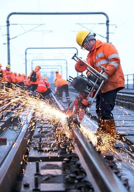 1月30日,国铁集团南昌局九江桥工段职工对京九铁路九江长江大桥钢轨焊缝进行打磨。