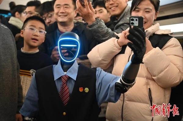 2月1日,杭州客运段“西子号”G41列车迎来宇树科技的机器人编外“乘务员”。机器人“乘务员”穿梭车厢,为旅客送去新春祝福。根据春运“舒适出行”需求,“西子号”列车设置1节“静音”车厢。乘务员将引导旅客保持安静,并为有需要的旅客提供免费“静音包”。中青报·中青网记者 李剑平/摄