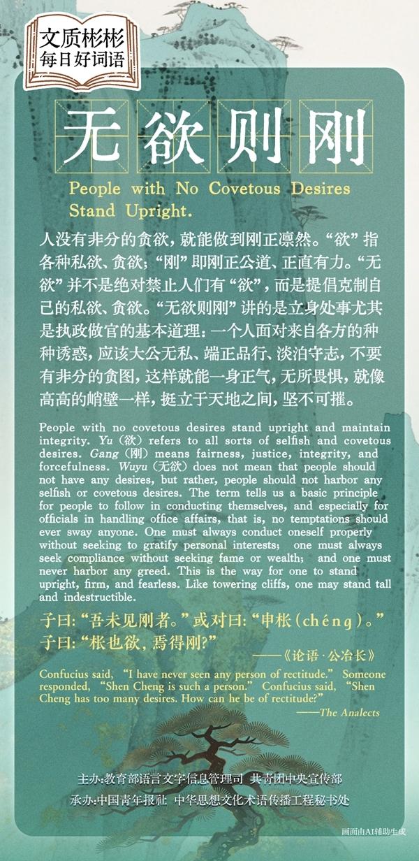 People with no covetous desires stand upright and maintain integrity. Yu refers to all sorts of selfish and covetous desires. Gang means fairness, justice, integrity, and forcefulness. Wuyu does not mean that people should not have any desires, but rather, people should not harbor any selfish or covetous desires. The term tells us a basic principle for people to follow in conducting themselves, and especially for officials in handling office affairs, that is, no temptations should ever sway anyone. One must always conduct oneself properly without seeking to gratify personal interests; one must always seek compliance without seeking fame or wealth; and one must never harbor any greed. This is the way for one to stand upright, firm, and fearless. Like towering cliffs, one may stand tall and indestructible.