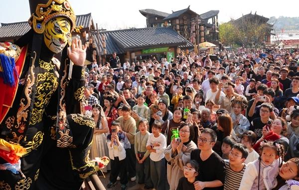 2月22日,民间艺人在湖南省衡阳市南岳区南岳里表演变脸。春节假期进入尾声,人们体验非遗、赏景休闲,享受多彩假日。曹正平/摄(新华社发)