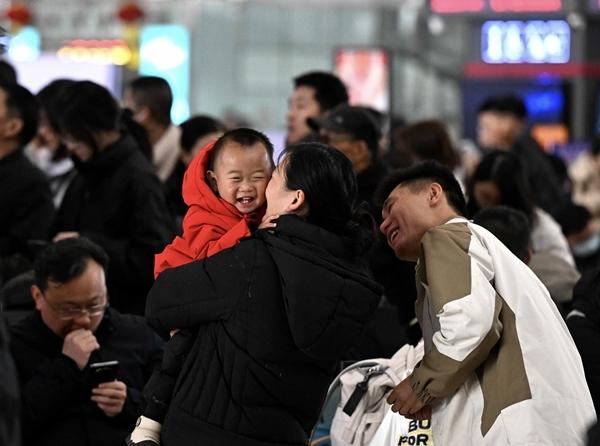 2月23日,一名小旅客和家人在河北石家庄火车站候车大厅候车。2月23日正月初七是春节假期最后一天,全国铁路迎来返程客流最高峰,预计发送旅客1850万人次。陈其保/摄(新华社发)