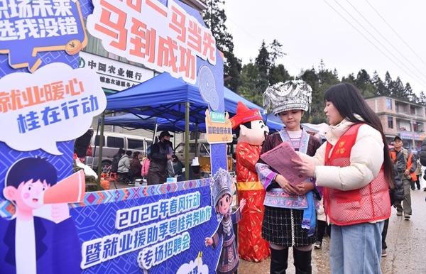 3月1日,在广西柳州市融水苗族自治县安太乡“十三坡会”上,人们在了解岗位需求信息。当日,融水苗族自治县在安太乡“十三坡会”上举行2026年春风行动暨就业援助季粤桂劳务协作专场招聘会,两地多家企业提供数百个工作岗位。近年来,该县在结对帮扶的广东省廉江市支持下,利用春节“苗族系列坡会群”人流量大的特点,将就业招聘会办到乡镇村屯,方便群众就业。新华社记者 黄孝邦/摄