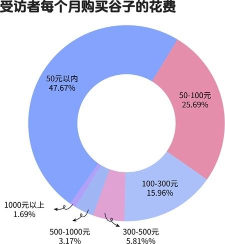 像溆溆一样的“吃谷”爱好者,如今不在少数,“吃谷”成为年轻人中的一股热潮。中国青年报·中青校媒近期面向以大学生为主的青年发起“吃谷”相关问卷调查,共回收有效问卷2327份。调查结果显示,40.65%受访者曾购买过“谷子”,购买渠道包括线上电商(80.02%)、线下实体店(68.82%)、漫展(23.04%)、线上跟团(24.31%)、二手交易平台(26.96%)、找国外代购(11.31%)等。受访者平均每月购买“谷子”的花费大都在300元以内,包括50元以内(47.67%)、50元到100元(25.69%)、100元到300元(15.96%)。也有一些受访者会花更多钱在“吃谷”上,如300元到500元(5.81%)、500元到1000元(3.17%)、1000元以上(1.69%)。