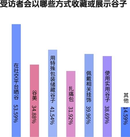 中青校媒调查显示,“吃谷”的受访者会用各种方式收藏或展示“谷子”,包括在社交平台“晒谷”(53.59%)、用特殊包装储藏“谷子”(41.54%)、佩戴相关挂饰(39.96%)、使用实用“谷子”(如毛巾、杯子等)(38.69%)、谷美(34.88%)、扎痛包(31.92%)等。