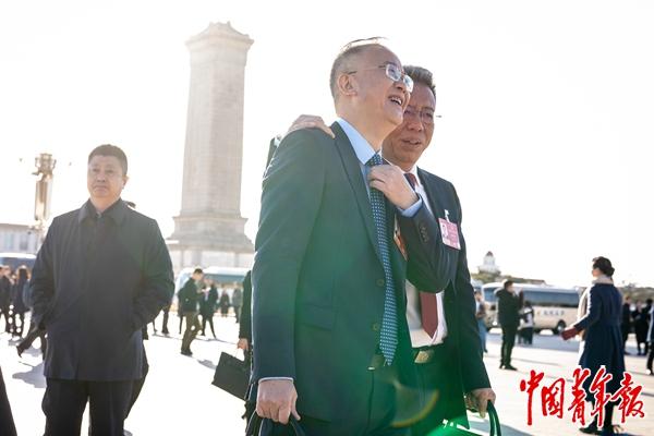 3月9日,北京,十四届全国人大四次会议第二次全体会议开始前,全国人大代表们步入会场。中青报·中青网记者 李隽辉/摄