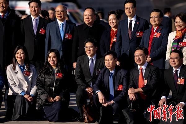 3月9日,北京,十四届全国人大四次会议第二次全体会议开始前,香港团部分人大代表在广场上合影。中青报·中青网记者 李隽辉/摄