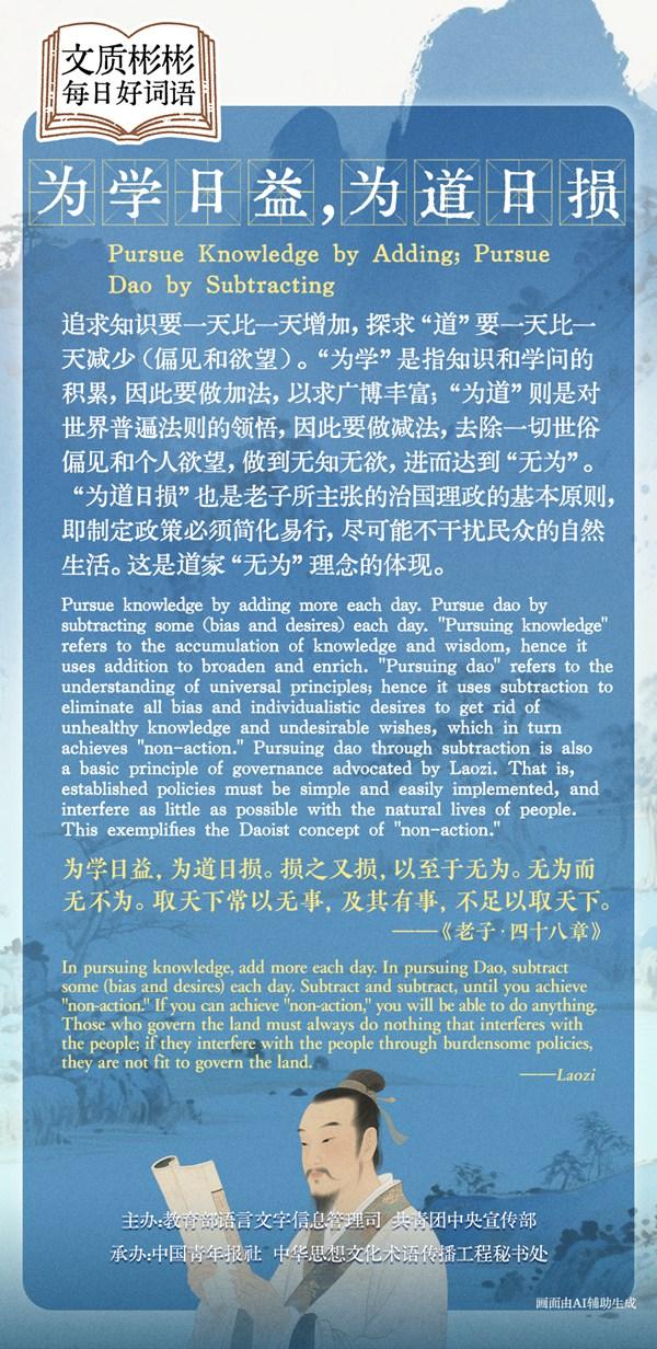 为学日益,为道日损。损之又损,以至于无为。无为而无不为。取天下常以无事,及其有事,不足以取天下。(《老子·四十八章》)(求知要一天比一天增加,求道要一天比一天减少。减少再减少,直至达到“无为”的境地。如果能够做到“无为”,任何事情都可以做成。治理天下的人,要保持清净而不干扰民众,如果施政繁苛、干扰民众,那就不配治理天下。)