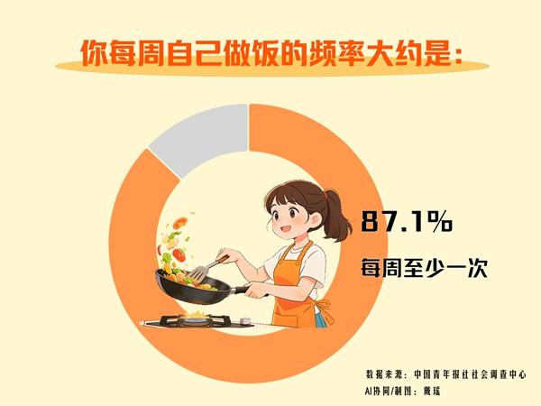 择菜清洗、起锅烧油、大火翻炒……年轻人是否还愿意站在灶台前,为自己好好做一顿饭?近日,中国青年报社社会调查中心联合问卷网(wenjuan.com)进行的一项1333人参与的调查显示,87.1%的受访青年每周至少会做一次饭。吃得干净健康,是受访青年尝试自己做饭的首因。