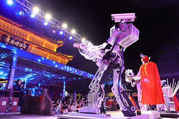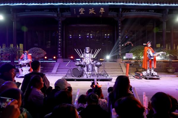 4月1日,安徽休宁,休宁县状元博物馆举办机器人乐队科技音乐秀,智能机器人现场演奏,吸引众多市民前来打卡,感受科技与文旅融合的新体验。视觉中国供图
