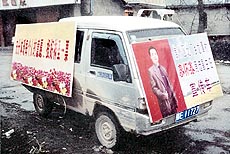 宣传车前面宽2米多、高1米多的展板上,一幅占了展板三分之一的巨幅照片格外引人注目。车身有“信州区北门乡龙潭村廖怀鑫竞选副主任宣传车”的字样,两侧各挂着一块标语:“贯彻《村民委员会组织法》,公开、公正竞争”;“充分体现每个人的意愿,投好神圣一票”。