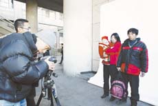 上图:日前,北京西客站站前广场上,一位名叫周海的摄影师在为过往农民工免费拍照。