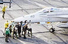 3月5日,海湾水域。“小鹰号”航母上,海军陆战队士兵正在调整