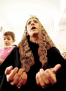 3月5日,巴格达。一名妇女在一所教堂里祈祷。下午5点,当地的所有教堂同时举行了和平祈祷仪式。新华社记者龚兵摄