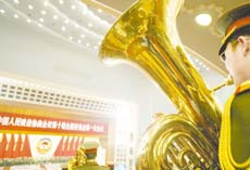 3月14日上午,全国政协十届一次会议在北京人民大会堂举行闭幕大会。大会结束时军乐团高奏国歌。