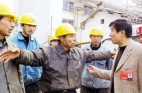 十届全国人大代表王元成日前来到北京一家建筑工地,了解进城务工人员的生活状况。一位农民工向他诉说了一段被遣送的经历。王元成曾是一名打工青年,家住山东泰安农村,现在泰安办学。本报记者晋永权摄