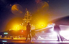 ▲战机轰鸣 2003年3月20日晚,海湾水域的一架F-14A“雄猫”战斗机正飞离美国“小鹰”号航母执行对伊作战任务。新华社/法新 |