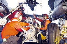 ▲安装炸弹 2003年3月20日,在美国“杜鲁门”航母飞行甲板上,空军地勤人员正把2000磅的卫星制导炸弹装到一架“大黄蜂”战斗机上。新华社/法新 |