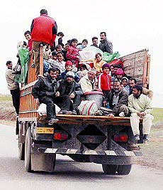 ▲逃离伊拉克的难民 2003年3月18日,为躲避战乱,防止受到生化武器的袭击,伊拉克北部基尔库克地区的居民大举搬迁。 |