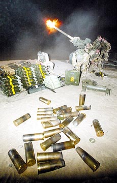 ▲大炮开火 2003年3月20日,英军第29炮兵突击旅的士兵在科威特的阵地上向伊拉克南部发射炮火。新华社发 |