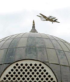 ▲土耳其为美开放领空 3月20日,一架飞机从土耳其南部城市阿达纳的清真寺上掠过。当日,土耳其大国民议会批准了政府提交的为袭击伊拉克目标的美国战机开辟空中走廊的议案。新华社记者刘宇摄 |