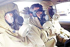 ▲以色列加紧防生化 3月20日,参加防生化演习的人员赶赴模拟的爆炸现场。当天下午,特拉维夫200多名警察、边防军防生化部队人员举行联合防生化实战演习。新华社记者高学余摄 |