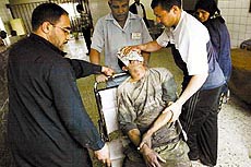 ▲空袭受伤的伊拉克人 2003年3月20日,一名在空袭中受伤的巴格达人被送到医院治疗。新华社/法新 |