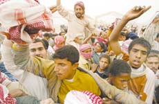 3月26日,科威特救援物资车队抵达伊南部城市赛夫万,并向伊拉克人发放救援物资。