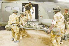 3月26日,在伊拉克南部,一名受伤的英军士兵正被抬上直升机。这名士兵是在伊南部作战时受伤的。