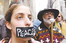 3月27日,在纽约第五大道,一名妇女嘴上贴着写有“和平”字样的胶布,反对美国对伊拉克发动的战争。