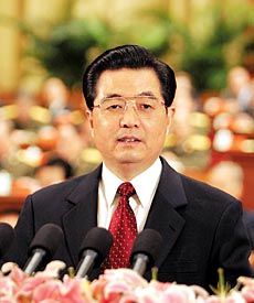 | 6月13日,中共中央总书记、国家主席、中央军委主席胡锦涛在陈云同志诞辰100周年纪念大会上发表重要讲话。 新华社记者