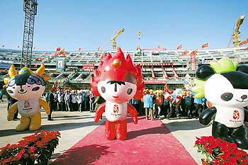 11月15日,奥运吉祥物“福娃”被请进国家体育场施工场地,庆贺混凝土主体结构施工封顶。国家体育场是08年北京奥运会的主体育场,又称大“鸟巢”。
