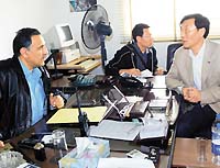 2月3日,在埃及红海港口城市塞法杰港,中国驻埃及大使馆一等秘书霍文杰(右)在与埃及有关官员核对红海沉船事故中的乘客名单。新华社记者