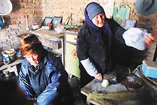75岁的王修贤和老伴安生芝正在屋里准备做午饭。屋里很暗,桌子上的菜板上放着十来个有些发黑的饺子。“这是年二十九晚上儿媳妇送来的菜饺子,还没有吃完呢。”安生芝说。“老伴一直觉得饺子是好东西,只有过年才吃得上,初一早上吃了几个后,一直舍不得吃,说是要留到十五。”王修贤说,过年那天晚上儿女们还给老人送来了一大口袋馍。说着,老人就掰了一块就着面汤吃起来。安生芝老人前些年中风,现在一直行动不便。年前,倔强的老头子不顾儿女的劝阻,去了外面的大城市捡破烂,希望多挣些钱,回来给老伴看病。“现在粮食卖不起价钱,玉米每斤5毛,小麦也只能卖每斤6毛钱。”王修贤的儿子王志金说,他家靠种粮食,每年也只有不到千元的收入。“前些年,我栽过苹果,但后来销路不好,无奈又停了下来。”他说,以前村里有好多果园,现在果树已经基本砍光了。