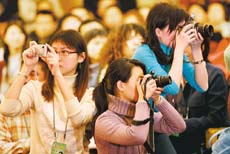 3名女记者在政协新闻发布会上抓拍新闻照片。