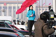 在北京人民大会堂内,香港凤凰卫视的著名女主持人吴小莉利用会议间隙与同行交流。