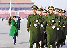 在天安门广场上,一位女士将镜头对准了正在执勤的英武的武警战士。