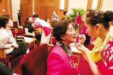 来自上海的全国人大代表李葵南正在后台化妆。她和另外几名上海团的全国人大代表客串登台,合唱了一曲《天堂》,为联欢晚会助兴。