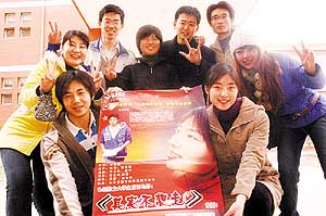 3月11日下午,电影《其实不想走》的部分主创人员在首映式前合影留念。当日,由山东交通学院大学生自编、自导、自演的电影《其实不想走》在该校举行首映式,千余名学生欣赏了这部特殊的电影。