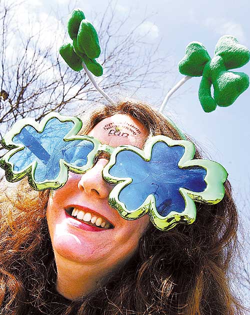 Gr o s s 戴着“太阳镜”观看圣帕特里克节游行。这是在芝加哥举行的第51届圣帕特里克节。国新供