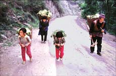 ▲一位5岁的四川女童和她9岁的姐姐帮助爷爷奶奶从五里外的责任田往家背大白菜。姐妹俩的父母在外地打工。