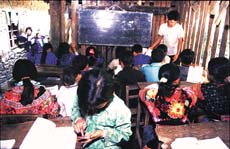 ▲广西隆林各族自治县山区,学生挤在一间临时搭建的棚子里上课。